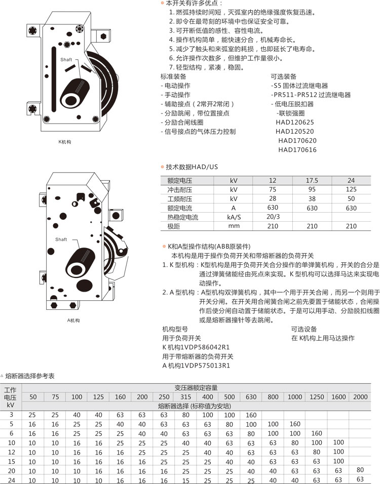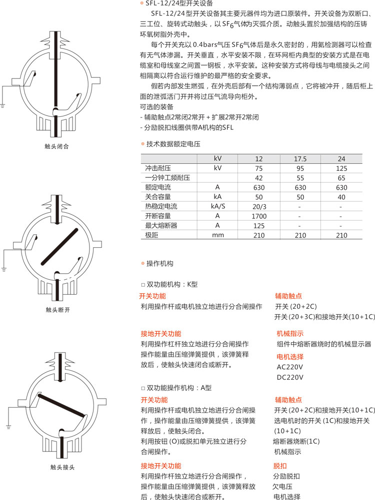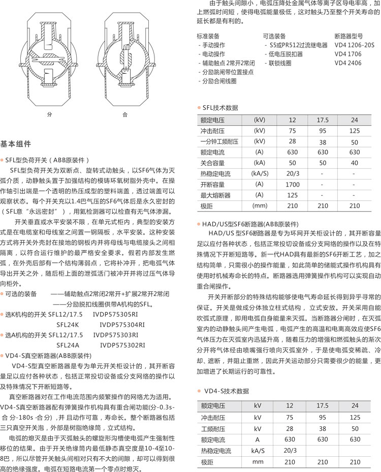 環(huán)網(wǎng)柜的主開關(guān)、操作機構(gòu)及元器件采用ABB公司原裝件或采用進口部件國內(nèi)組裝生產(chǎn)的SFL-12/24型 開關(guān)設(shè)備,也可根據(jù)用戶需要配裝ABB公司原裝HAD/US型SF6。斷路器或VD4-S型真空斷路器,其操作方式分為手動、電動兩種。