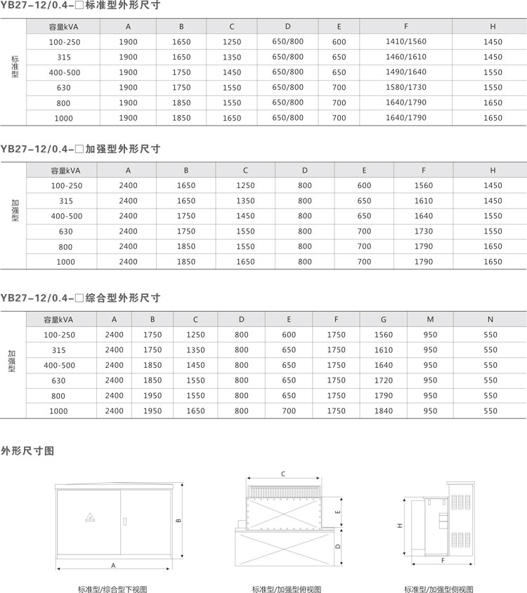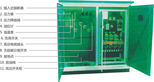 該產(chǎn)品將高壓負(fù)荷開關(guān)、高壓熔斷器置于變壓器油中,具有與變壓器器身共箱或分箱兩種結(jié)構(gòu)形式。油箱采用全密封結(jié)構(gòu),配有油溫表、油位表、壓力表、壓力釋放閥、放油閥等元件以監(jiān)測(cè)變壓器運(yùn)行狀況。該產(chǎn)品分為環(huán)網(wǎng)型、終端型及電源型供電方式。為了使此種產(chǎn)品更適合于我國(guó)電網(wǎng)的實(shí)際要求,公司又推了插拔型干式熔斷器,熔絲的熔斷不影響變壓器油的性能。根據(jù)低壓饋出要求的復(fù)雜程度,YBM-12/0.4型產(chǎn)品分為標(biāo)準(zhǔn)型、加強(qiáng)型和綜合型三種外殼形式,使用戶和設(shè)計(jì)單位在選型時(shí),做到更靈活、更經(jīng)濟(jì)。