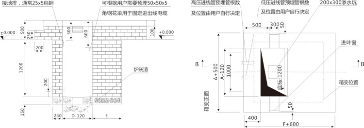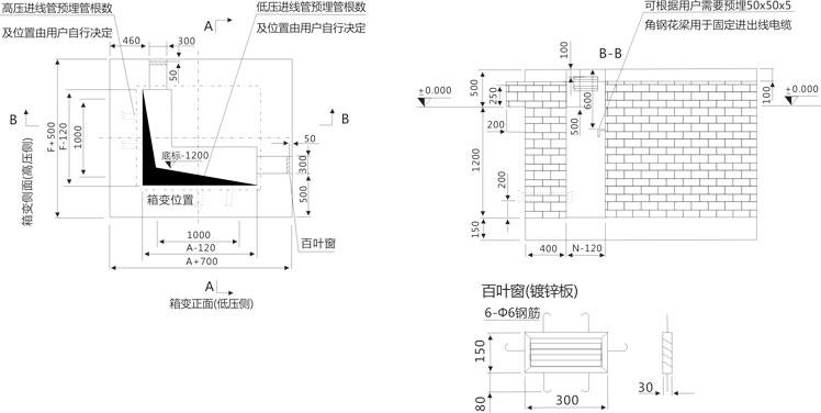 ◎ 為進(jìn)線方便用戶可根據(jù)現(xiàn)場(chǎng)實(shí)際情況在三個(gè)或四個(gè)方向設(shè)置電纜井。