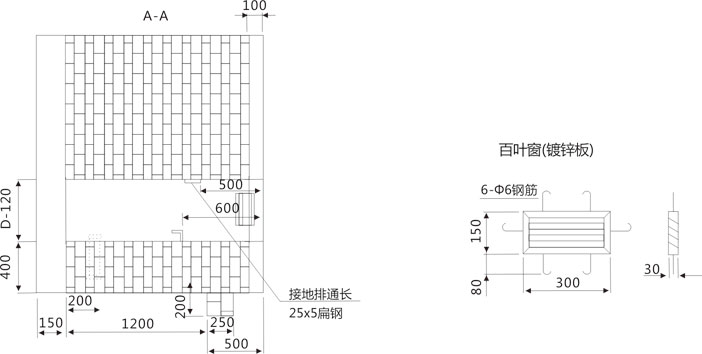 ◎ 百葉窗里惻加焊150x300的鋼板網(wǎng)(10x20)菱形眼,百葉窗外框焊筋爪埋入墻內(nèi)。